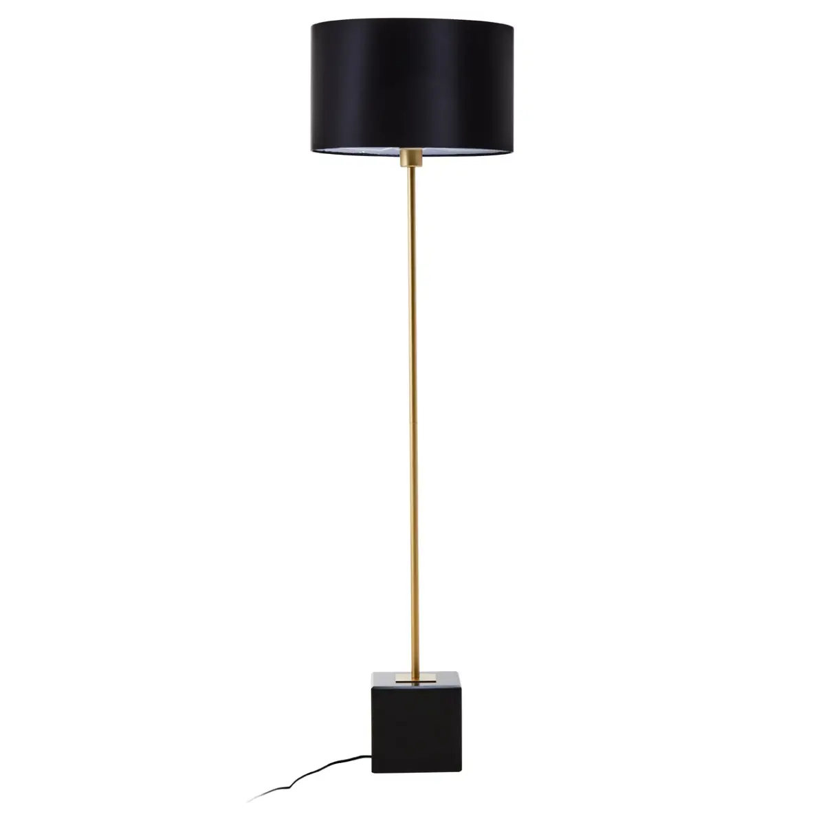 This modern floor lamps features a sleek gold metal stem complemented by a black marble base and black linen shade.