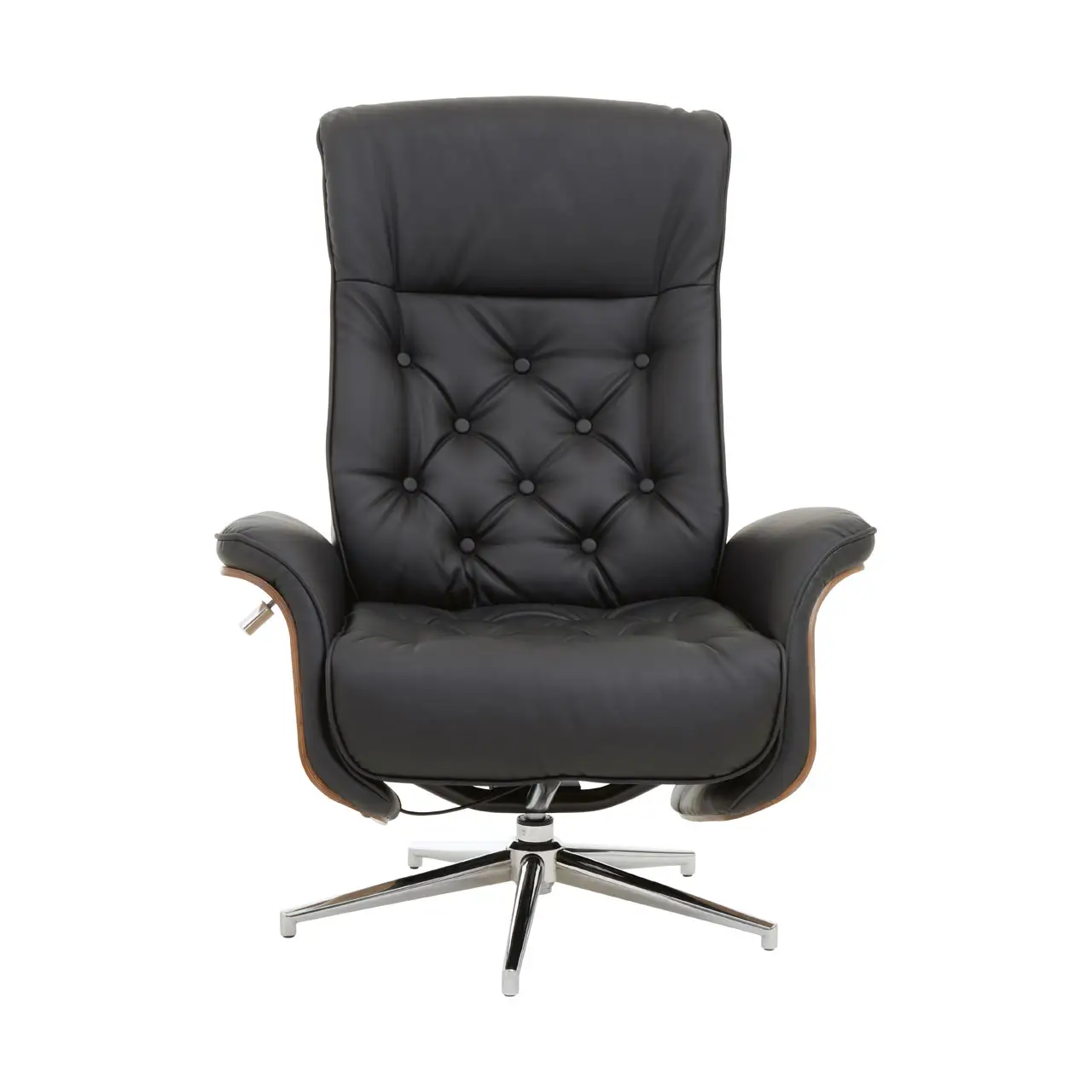 Elevate your home or office space with this stunning deep-buttoned iconic faux black leather recliner and matching footstool. Put your feet up and relax.