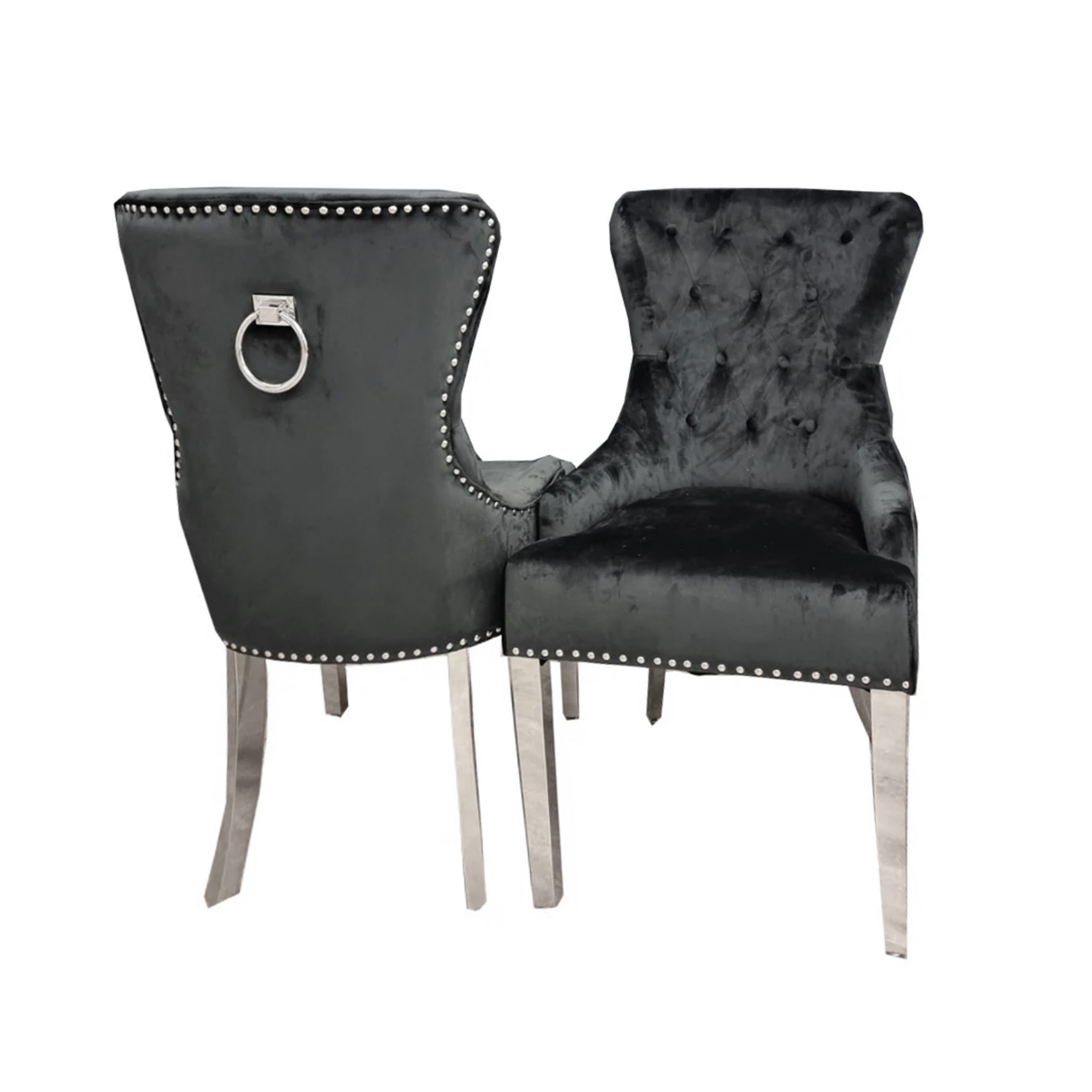 Hyde Park Black Velvet Dining Chair with Chrome Ring and Stainless Steel Legs.