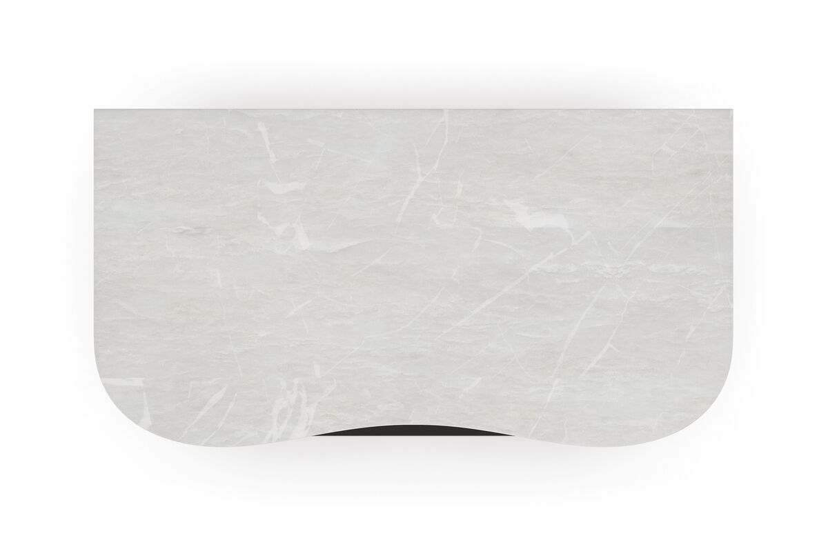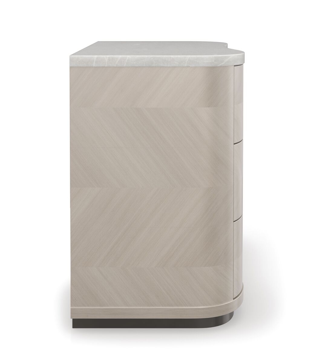 Pure luxury. Gently curving lines and soft close drawers, the soft ash hues of birchwood and koto veneers in a chevron pattern offset by the bronze plinth and handles plus the white rhino marble top, is a contemporary collector’s piece.