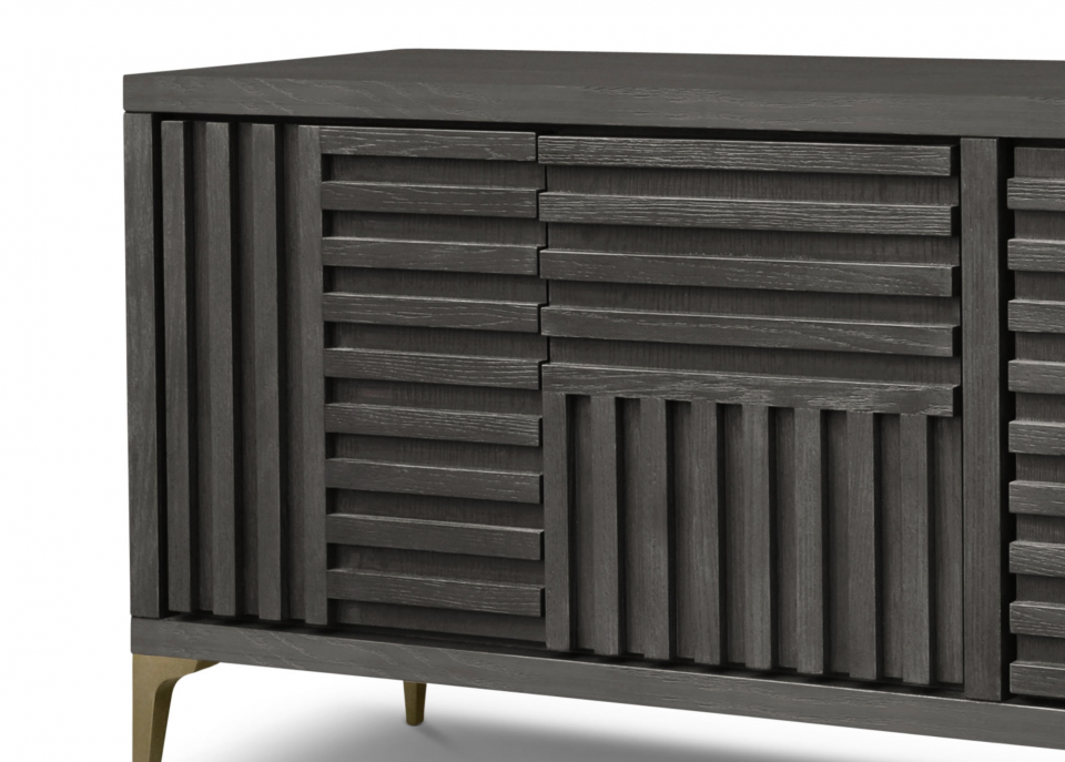Pure luxury. Gently curving lines and soft close drawers, the soft ash hues of birchwood and koto veneers in a chevron pattern offset by the bronze plinth and handles plus the white rhino marble top, is a contemporary collector’s piece.