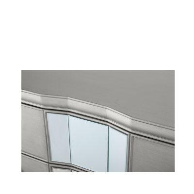 The distinctive French design with hints of baroque is reflected in the luxurious silver washed curves, bevels and mirrored details of this chest of drawers.